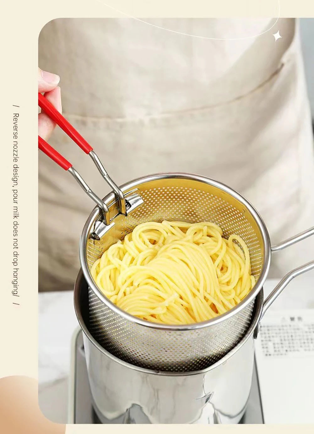 Rede de drenagem com alça de silicone anti-escaldante: mais segurança no manuseio.