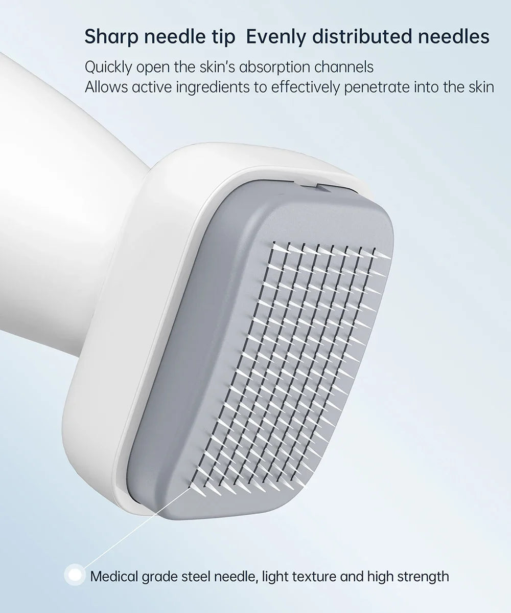 🔹 Tecnologia Avançada de Microagulhamento: As agulhas penetram suavemente as camadas superiores da pele, estimulando a produção natural de colágeno e aumentando a elasticidade da pele.
